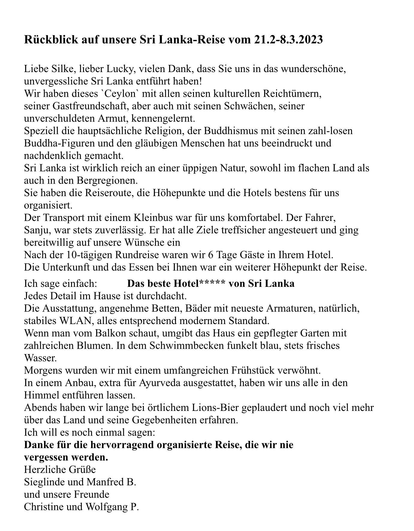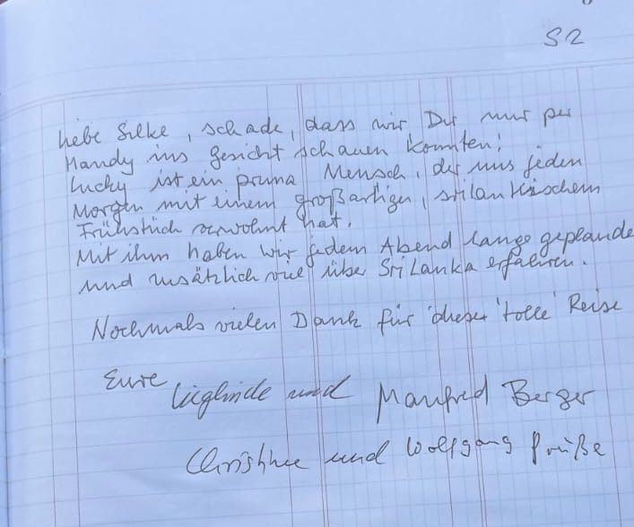 Silke and Lucky organized a five-day tour of Sri Lanka's sights for us. They were particularly attentive to our wishes, suggestions, and expectations. The tour was exceptionally well-organized; we didn't have to worry about a thing! Our German- and English-speaking guide was already waiting for us at the airport. Since we were a bit tired from the flight, our guide immediately reclined the seats in the car so we could relax a little before our first stop, an elephant sanctuary. The hotels, driver, and guides at the sights were all booked in advance. Silke and Lucky had chosen the accommodations very well. They weren't typical tourist hotels but truly good local hotels with a very special, authentic flair, allowing us to experience Sri Lanka and its people in a unique way. The five days were packed with experiences and impressions of an extraordinary country. Our guide took care of us the entire time. He handed us over to the tour guide right at the starting point of each sightseeing tour and was already waiting for us at the end to pick us up again. The hotels where we stayed worked the same way. Lucky was also in constant contact with him. We really saw a lot, were extremely well looked after and protected, and now, after five days, we're a bit exhausted.