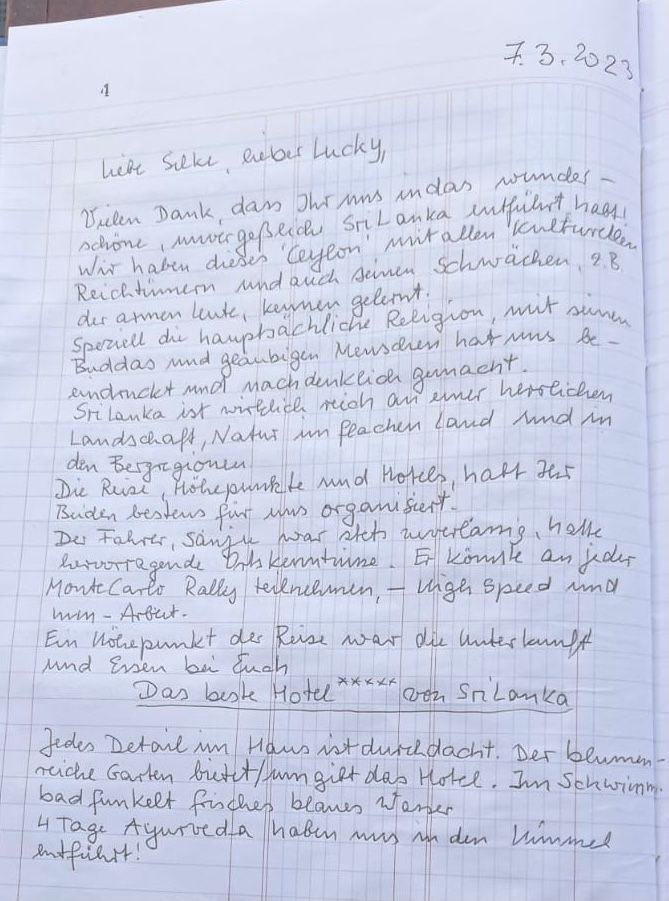 Silke and Lucky organized a five-day tour of Sri Lanka's sights for us. They were particularly attentive to our wishes, suggestions, and expectations. The tour was exceptionally well-organized; we didn't have to worry about a thing! Our German- and English-speaking guide was already waiting for us at the airport. Since we were a bit tired from the flight, our guide immediately reclined the seats in the car so we could relax a little before our first stop, an elephant sanctuary. The hotels, driver, and guides at the sights were all booked in advance. Silke and Lucky had chosen the accommodations very well. They weren't typical tourist hotels but truly good local hotels with a very special, authentic flair, allowing us to experience Sri Lanka and its people in a unique way. The five days were packed with experiences and impressions of an extraordinary country. Our guide took care of us the entire time. He handed us over to the tour guide right at the starting point of each sightseeing tour and was already waiting for us at the end to pick us up again. The hotels where we stayed worked the same way. Lucky was also in constant contact with him. We really saw a lot, were extremely well looked after and protected, and now, after five days, we're a bit exhausted.